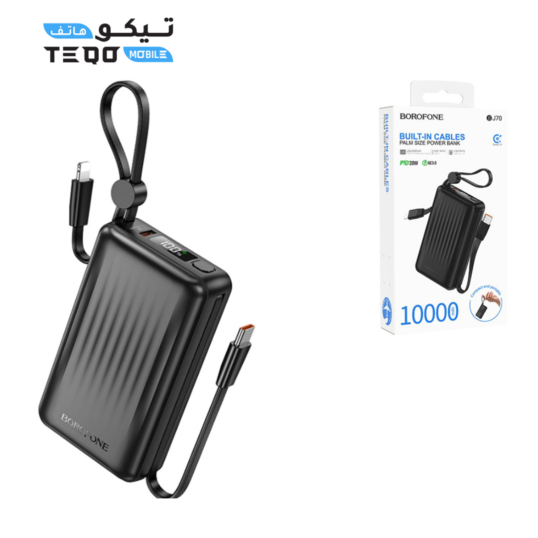 The Borofone BJ70 is the ultimate travel companion, designed to fit comfortably in your palm while delivering high-speed charging. Forget the mess of carrying extra wires; this power bank features built-in charging cables for both iPhone (Lightning) and Type-C devices. With its sleek, textured design and integrated hanging strap, it’s built for portability and style.